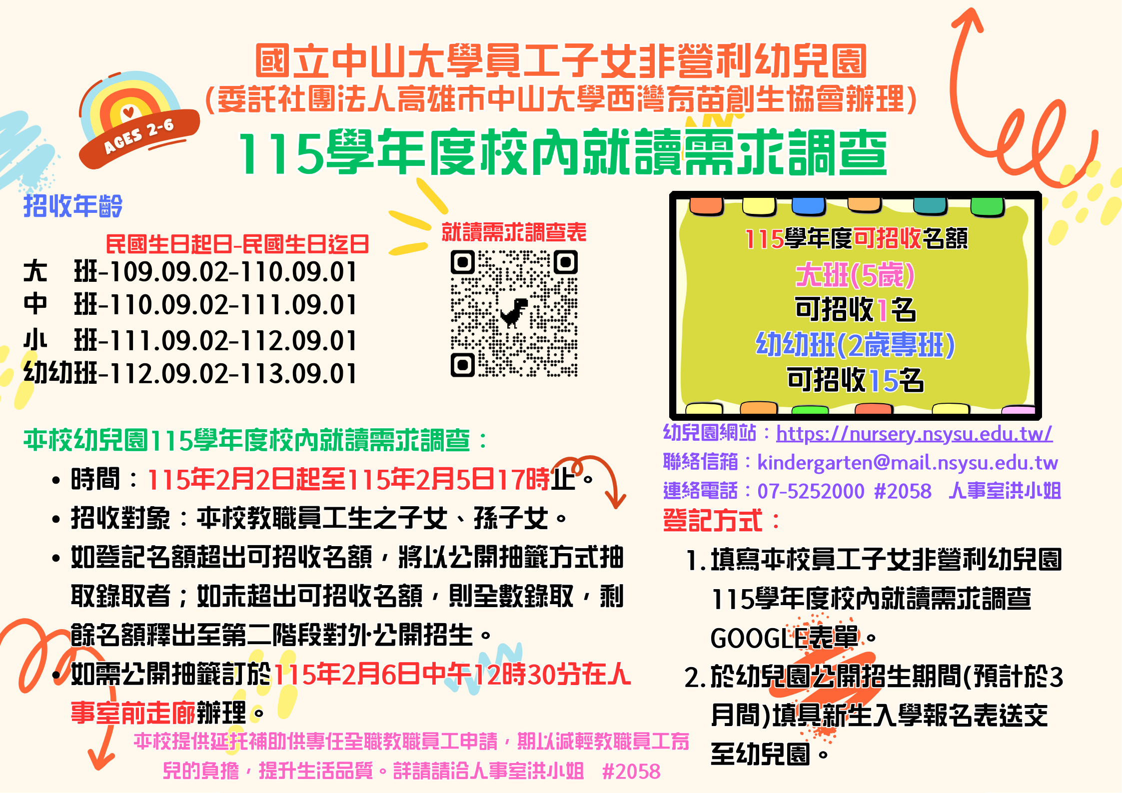 主旨:為調查本校員工子女非營利幼兒園115學年度校內就讀需求,自115年2月2日(星期一)至115年2月5日(星期四)17時止受理登記,請查照並轉知所屬教職員工生。