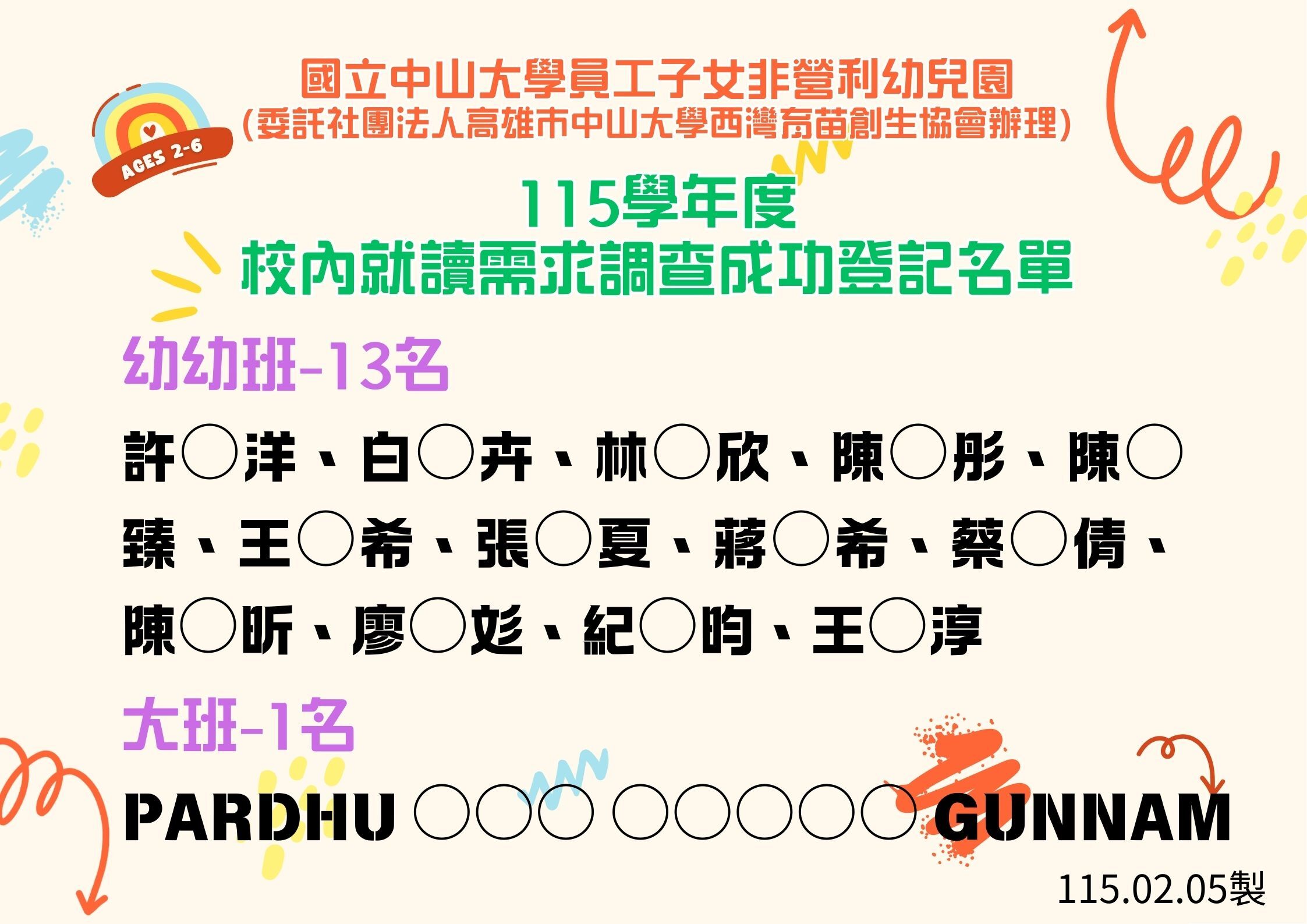 本校員工子女非營利幼兒園115學年度校內就讀意願調查登記結果公告